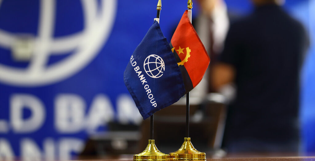 Bandeiras do Banco Mundial e de Angola, sob o fundo da instituição...